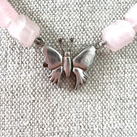 Rose Quartz Knotted Bead Necklace with 925 Silver Butterfly Clasp