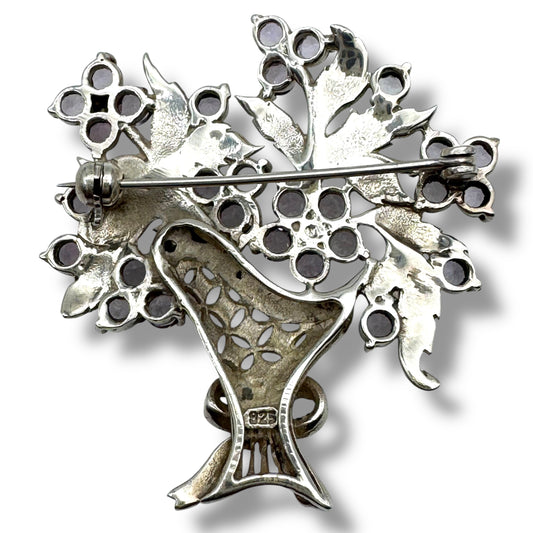 Vintage 925 Silver Victorian Revival Giardinetti Style Amethyst and Marcasite Flower Basket Brooch