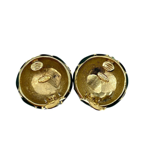 Ciro 1990's Large Gold Plated Domed Green and Purple Enamel and Crystal Clip On Earrings