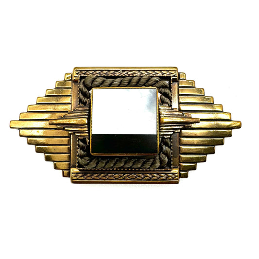 Ermani Bulatti 1980's Art Deco Inspired - Mother of Pearl, Onyx, and Silk Brooch and Clip On Earrings
