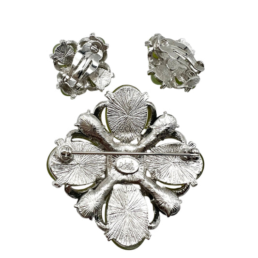Rare Joan Rivers Demi Parure Green Maltese Cross Brooch and Clip On Earrings