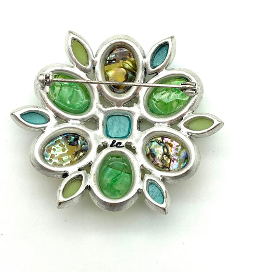 Liz Claiborne Blue and Green Faceted Glass, Stone and Paua Silvertone Brooch