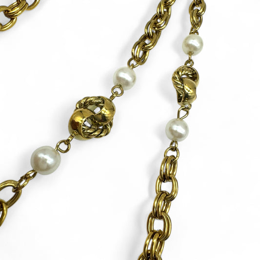 Vintage Faux Pearl and Twist Knot Double Chain Link Necklace