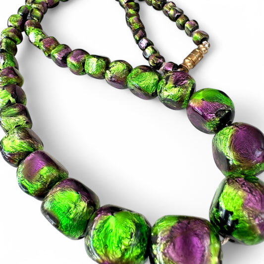 Bohemian Art Deco Cubed Foil Glass Graduated Necklace in Purple and Vivid Green Restrung on Pale Pink Silk