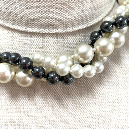 Heavy Hand Knotted Glass Pearl and Hematite Twisted Three Strand Necklace