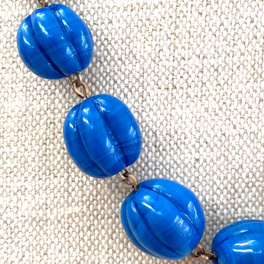 Art Deco Royal Blue Melon / Pumpkin Glass Bead (Graduating) Necklace (Agate effect)