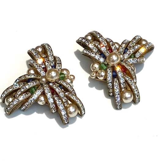 Art Deco Huge Channel Set Crystal Clip On Earrings with Glass Beads and Faux Pearls