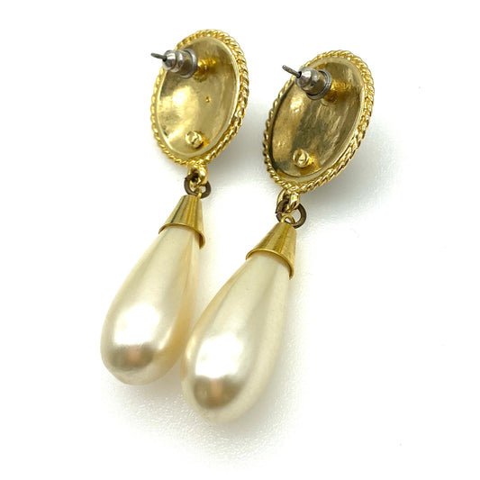 Vintage 1980's Large Dark Green Enamel and Pearl Dropper Pierced Earrings