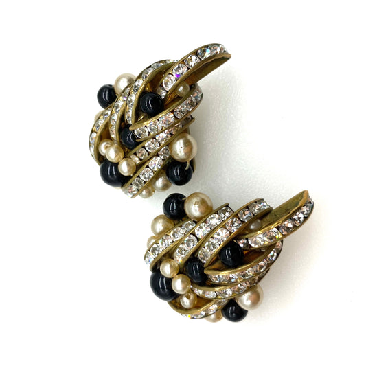 Art Deco Channel Set Rhinestone Clip On Earrings with Glass Beads and Faux Pearls