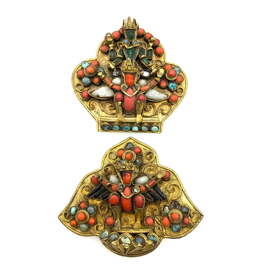 A Pair of Signed Antique Hand Crafted Inlaid Nepalese/Tibetan Brass Brooches