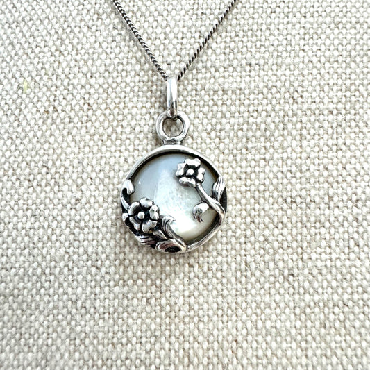 Vintage 925 Mother of Pearl Flower Signed Pendant Necklace