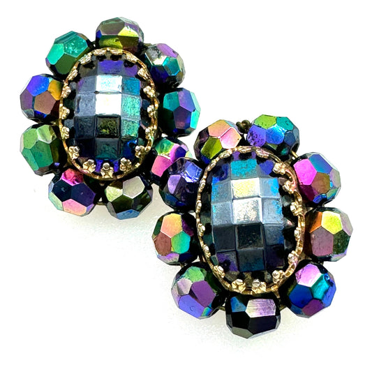 Vintage 1950's Midnight Faceted Bead and Iridescent Coating Clip On Earrings