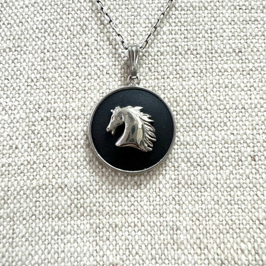 Wedgwood Horse Head Black Ceramic Round Pendant (Silver Plated?) on 925 Silver Necklace