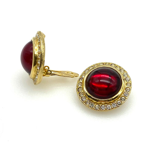 Unsigned Large Red Glass Cabochon Clip on Earrings