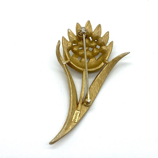 Crown Trifari Pearl Flower Textured Gold Plated Brooch 1960's