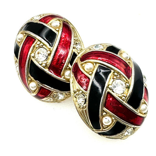 Vintage 1980's Oval Enamel Faux Seed Pearl and Rhinestone Clip On Earrings