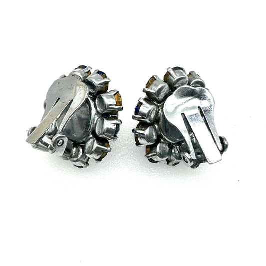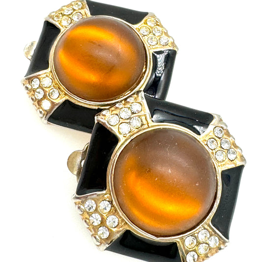 Signed Frosted and Foiled Cabochon Enamel and Rhinestone Clip On Earrings