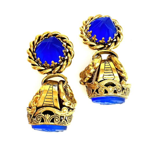 Signed Austria Blue Crystal Black Glass Clip On Earrings