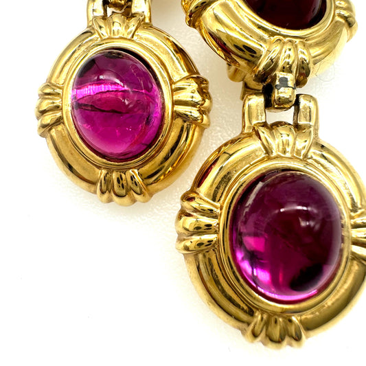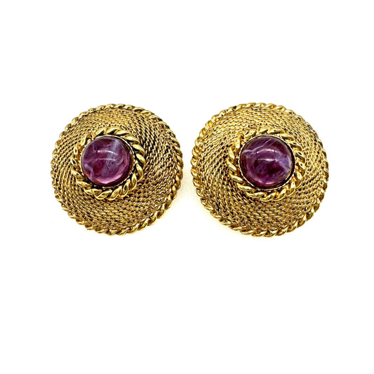 Vintage 1980's Purple Pink Art Glass Cabochon Domed Clip On Earrings