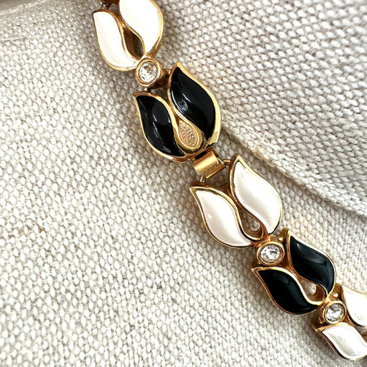 Vintage Black and White Enamel Stylised Tulip and Rhinestone Necklace Choker