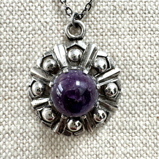 Silver Openwork Amethyst Cabochon Pendant on Sterling Chain Necklace
