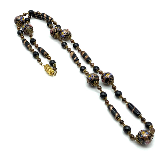 Collier de perles de gâteau de mariage en verre d'art vénitien noir noué à la main