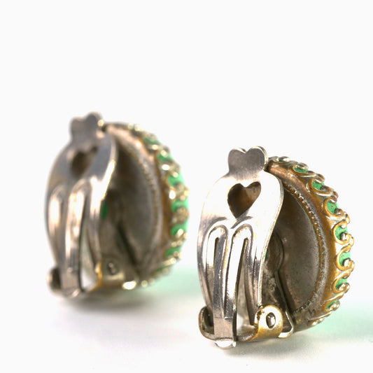 Une paire de clips en verre moulé vert vintage sur boucles d’oreilles avec réglage de griffe de dent de chien