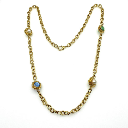 Collier de chaîne inspiré de Gripoix vintage non signé avec cabochons en verre et perles d’imitation étrusques