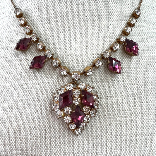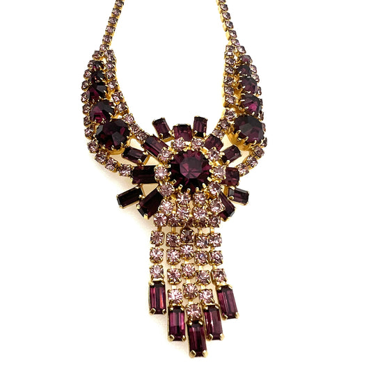 Collier strass des années 1950 avec griffe sertie aubergine et strass clairs