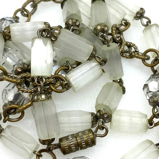 Collier de perles de verre givré Atlas satiné tchèque des années 1930 et plaque d’argent Collier de perles de verre en cristal clair