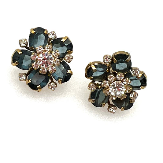 Clip de fleur en verre bleu fumé et strass non signé sur boucles d’oreilles