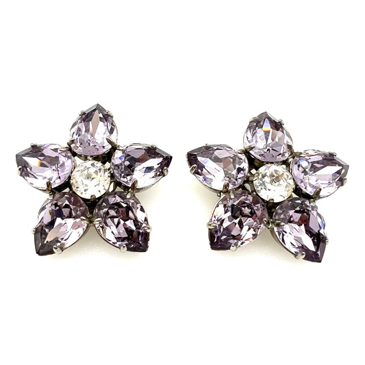 Grand clip de fleur lilas et strass clair non signé sur boucles d’oreilles