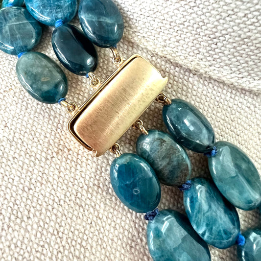 Collier à trois brins noué à la main en apatite bleue 925 avec une superposition d’or épaisse Fermoir magnétique en argent 925