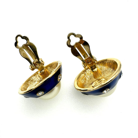 Vintage Blue Enamel and Rhinestone Faux Pearl Clip On Earrings
