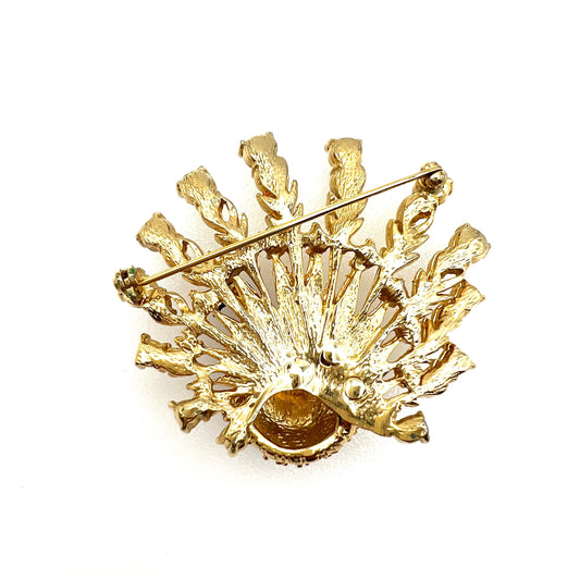 Broche paon en émail, strass et verre doré non signée