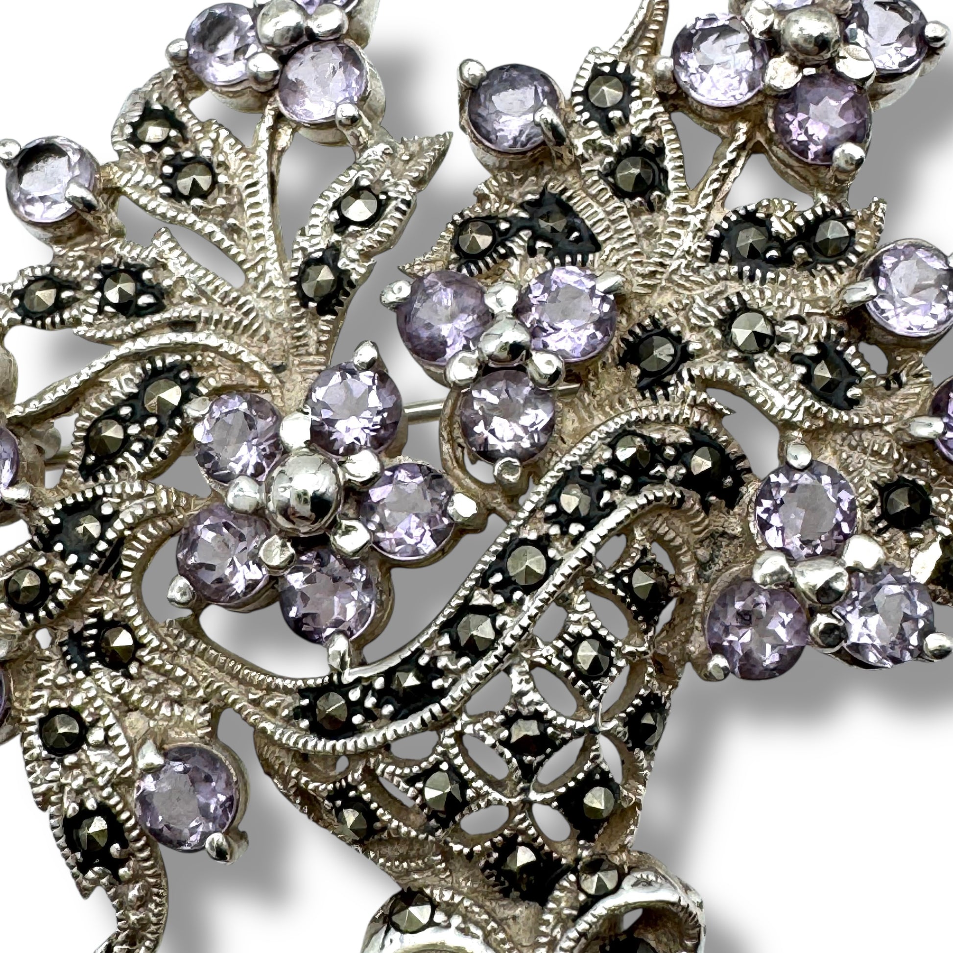 Vintage 925 Silver Victorian Revival Giardinetti Style Amethyst and Marcasite Flower Basket Brooch