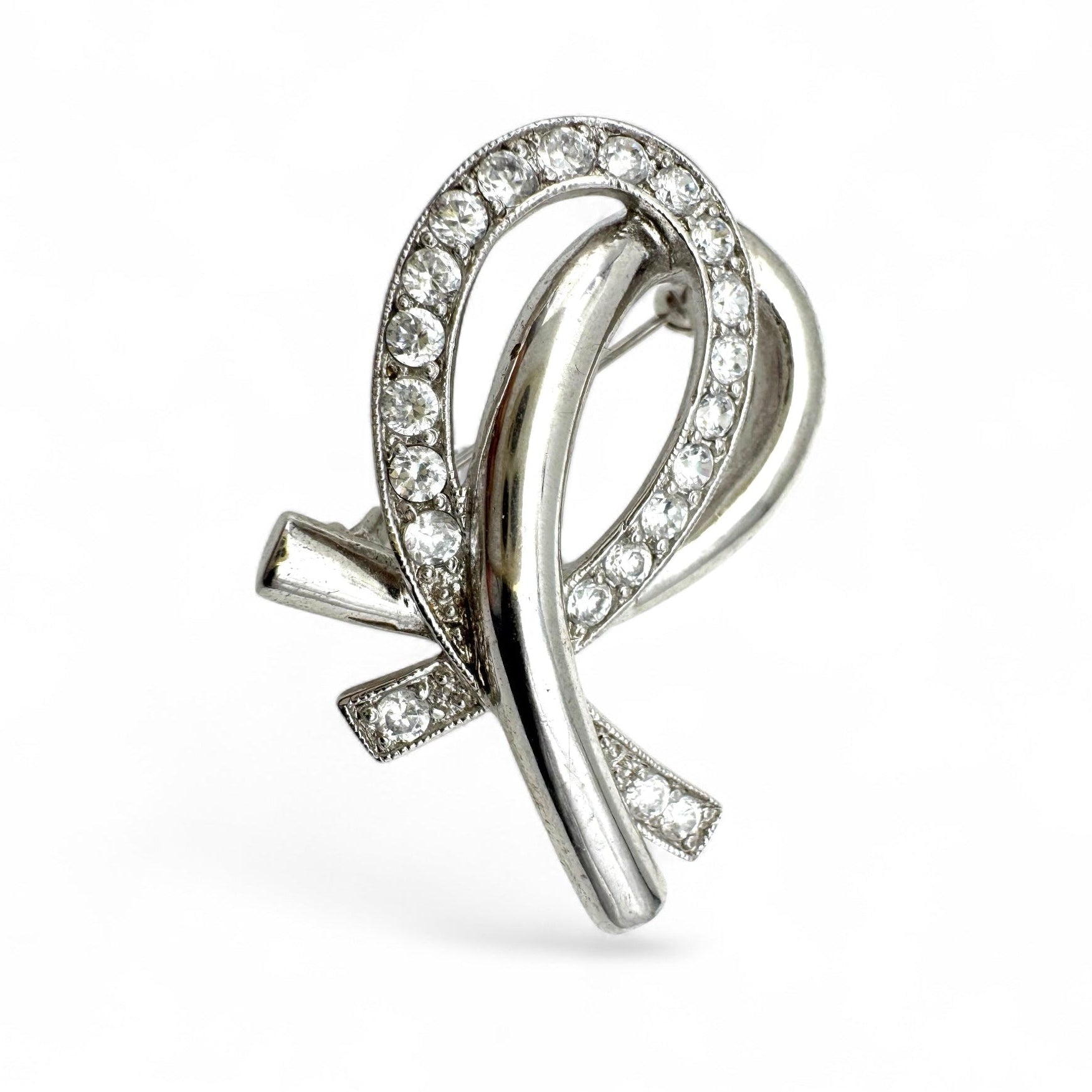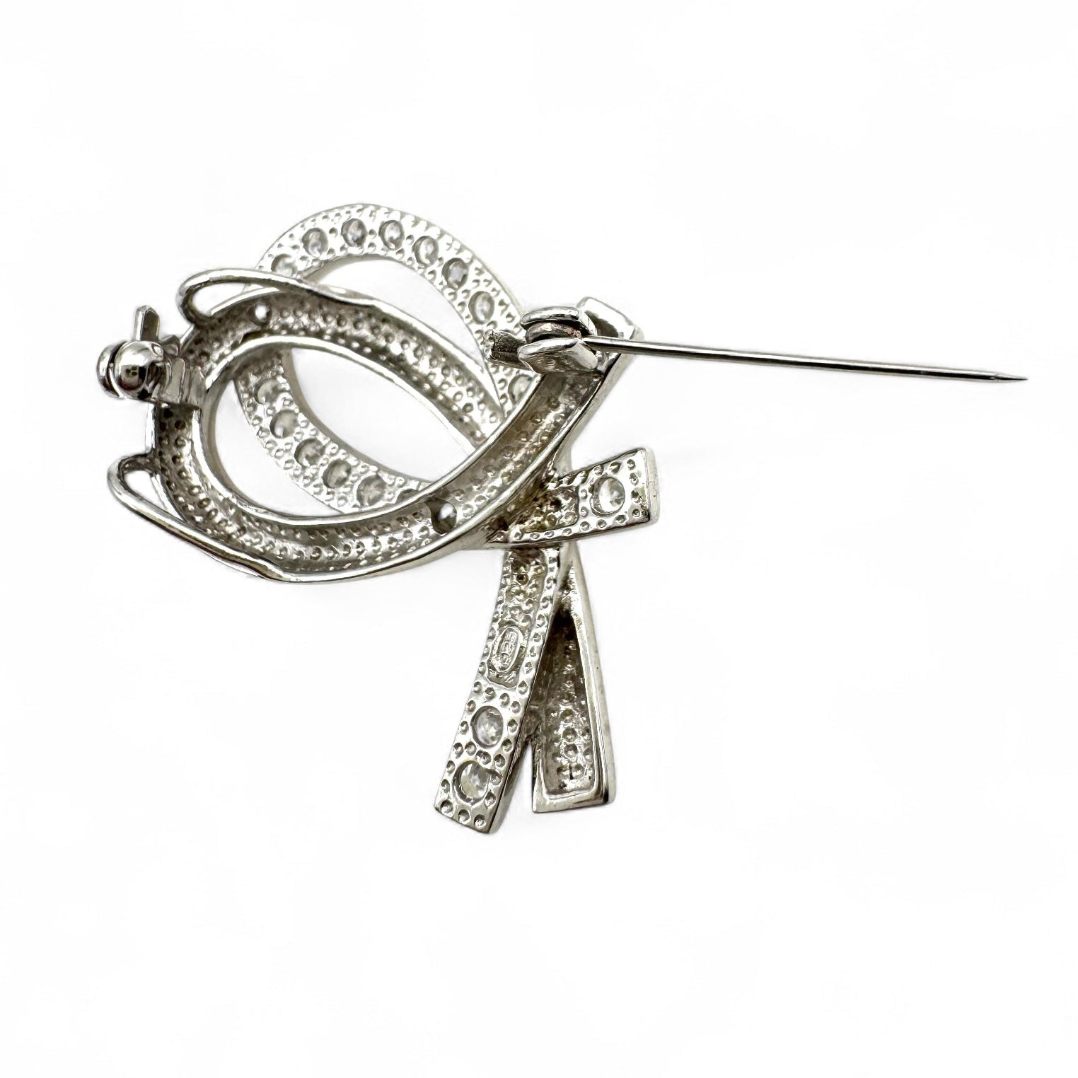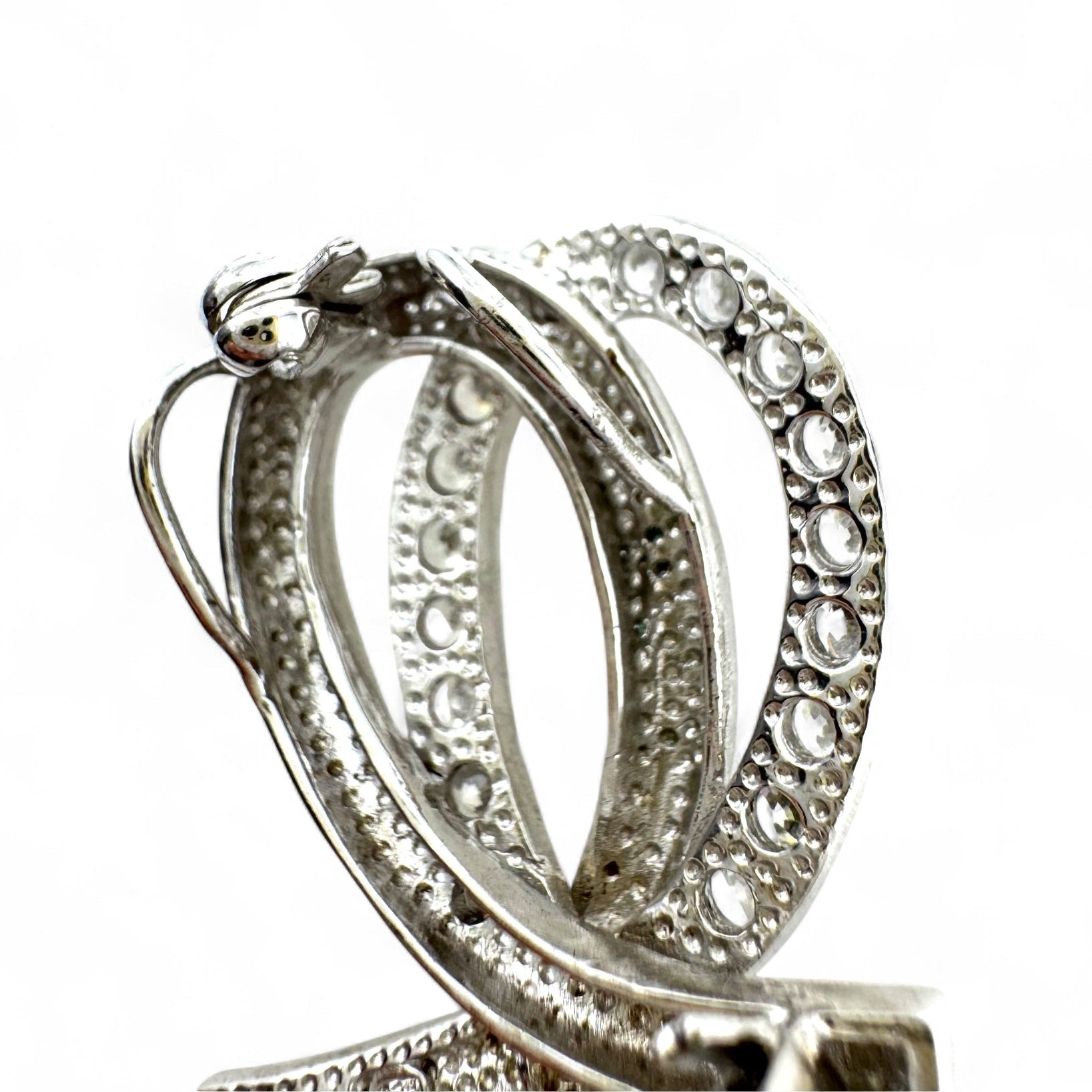 925 Silver Crystal Open Back Double Loop Brooch / Pendant featuring a double loop brooch, one in smooth silver and the loop with pave set clear round sparkling crystals. It is stamped on the reverse '925' on a raised oval cartouche and it measures 3.7cm high and 2.7cm at its widest point. It has a rollover pin as well as two integral bails, one on each side of the smooth silver loop.