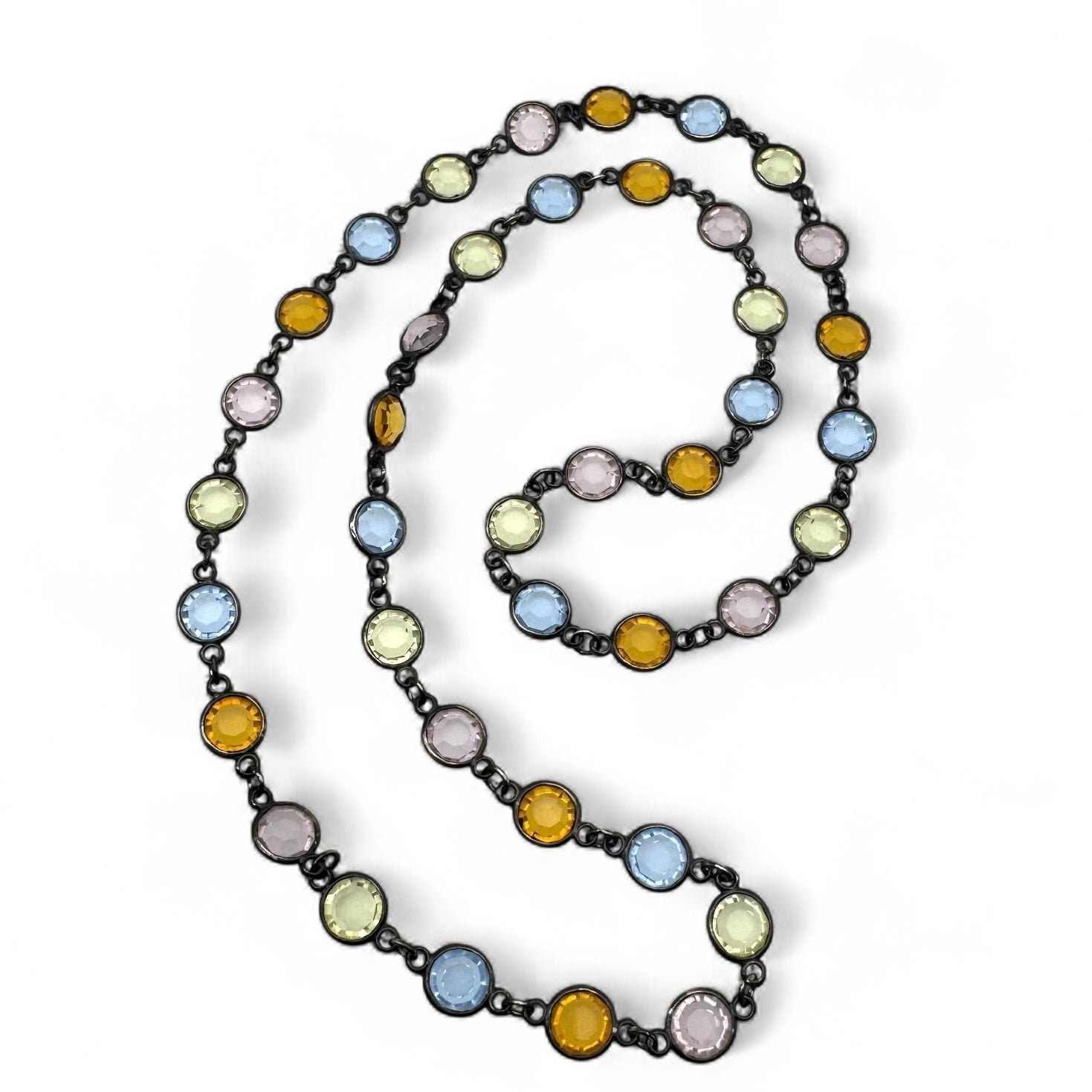 Crystal Bezel Set Pink, Blue, Orange, Pale Green/Lemon Necklace featuring a 68cm long necklace with no clasp with bezel set crystals in pink, blue and orange and pale green/lemon. The setting and links are in an antiqued silver. Lovely tactile weight of 28.4g. Pretty colours with lovely sparkle.