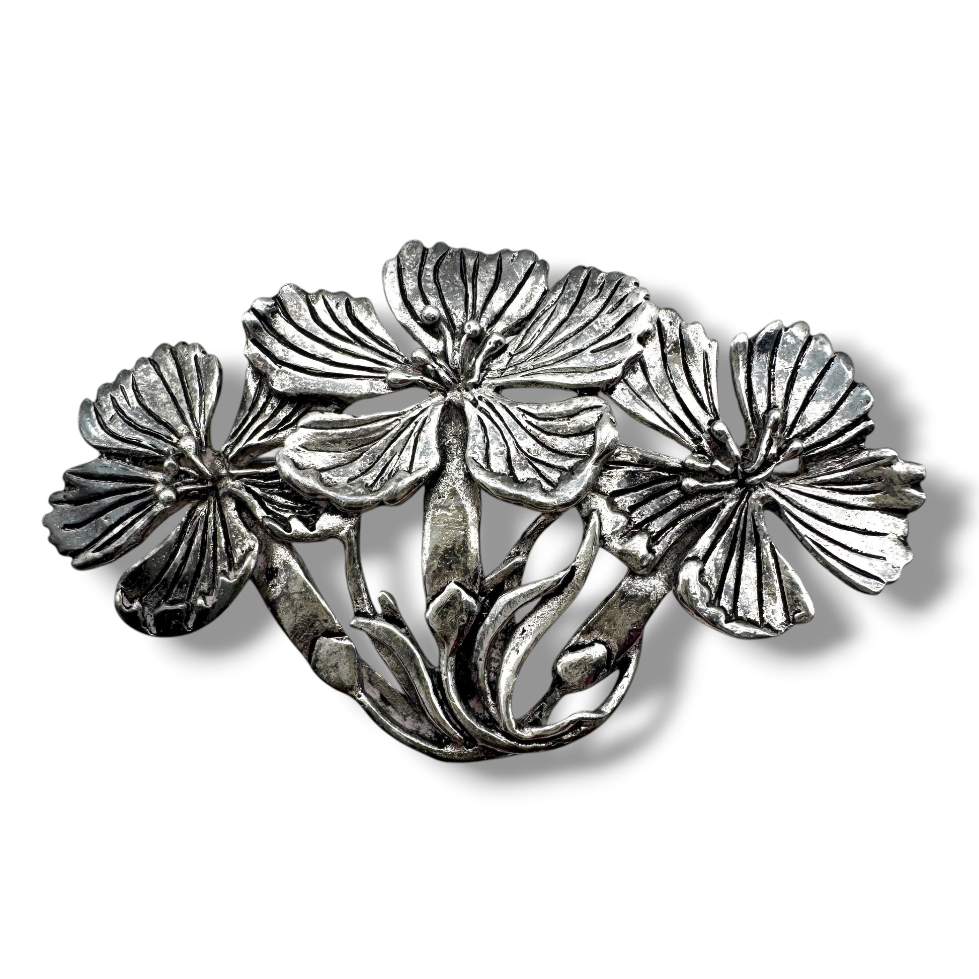 MASJ 1992 Silver Plated Pewter Floral Trio Brooch featuring a beautiful nouveau style floral design signed MASJ (Maureen Ann Story-Jones) for Silver Scenes Limited. This beautiful brooch has a rollover clasp and it measures 3.7cm high and 6.2cm wide and it weighs 12.9g. It is signed 'MASJ 92' on the reverse.