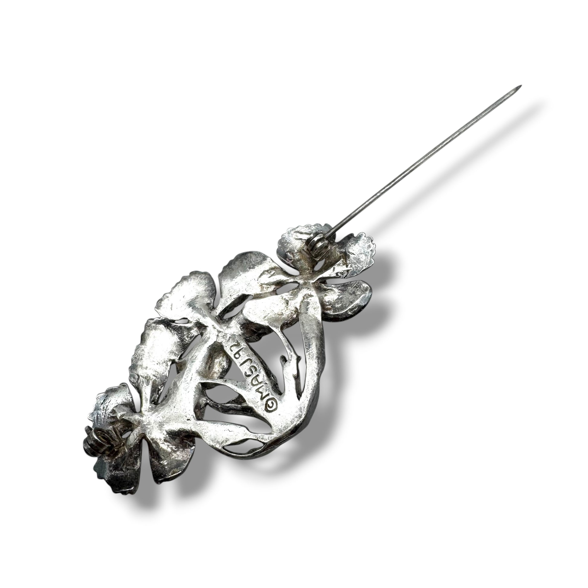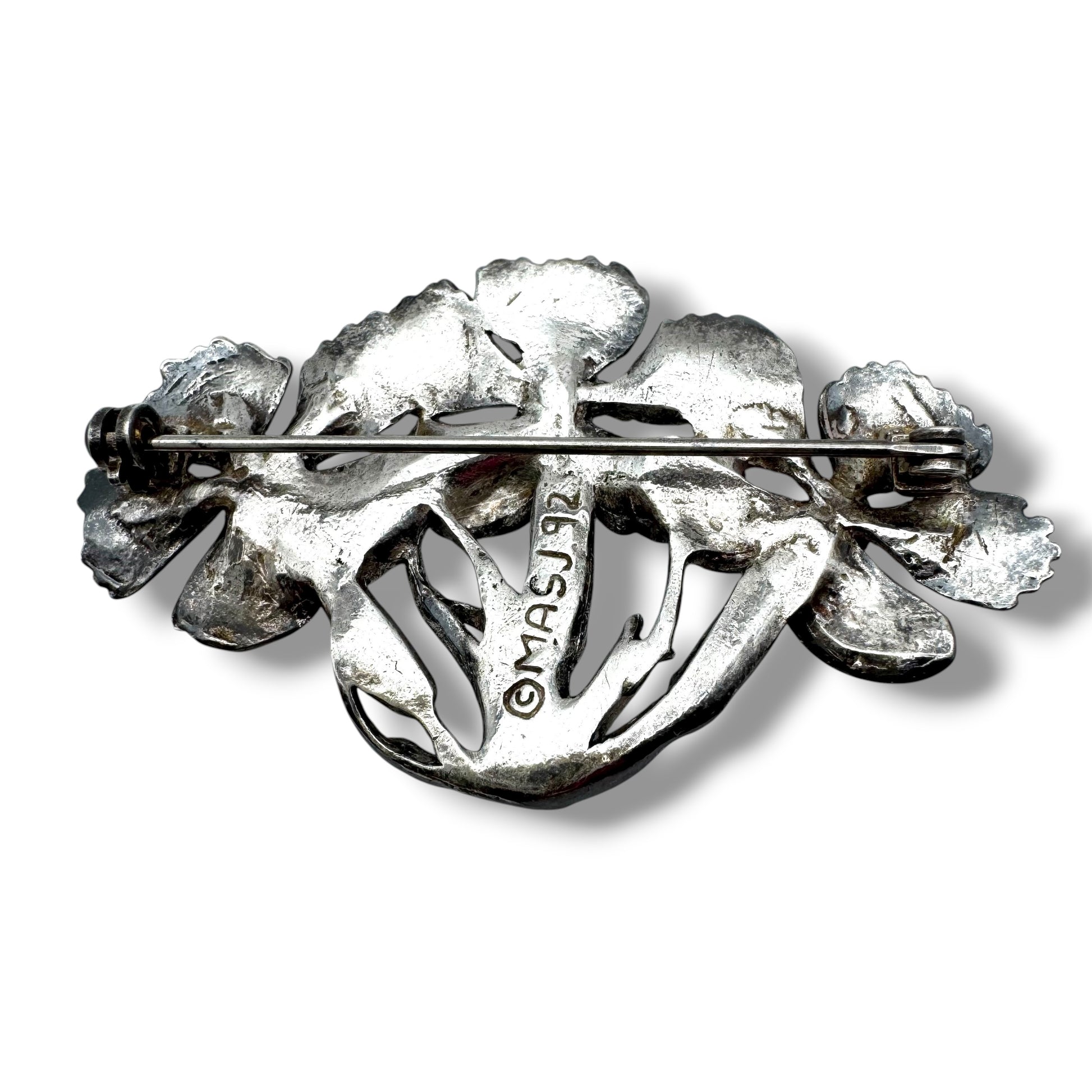 Edward Anthony and Maureen Ann Story-Jones established their family business focused on crafting silver jewellery and related items in the village of Berriew in Montgomeryshire, Wales, in 1984. In addition to jewellery, Edward Anthony and Maureen Ann crafted a variety of articles, including frames, clocks, pillboxes, and vases. The Silver Scenes collection primarily featured motifs inspired by nature, such as flowers, leaves, dragonflies, and butterflies, all meticulously detailed. These pieces were cast in pewter and then plated with silver or gold. The peak production of MASJ brooches occurred predominantly until the late 1990s, and today, they are highly sought after by collectors. Notably, MASJ pieces are often marked with a signature and date by hand or stamped with the MASJ logo.