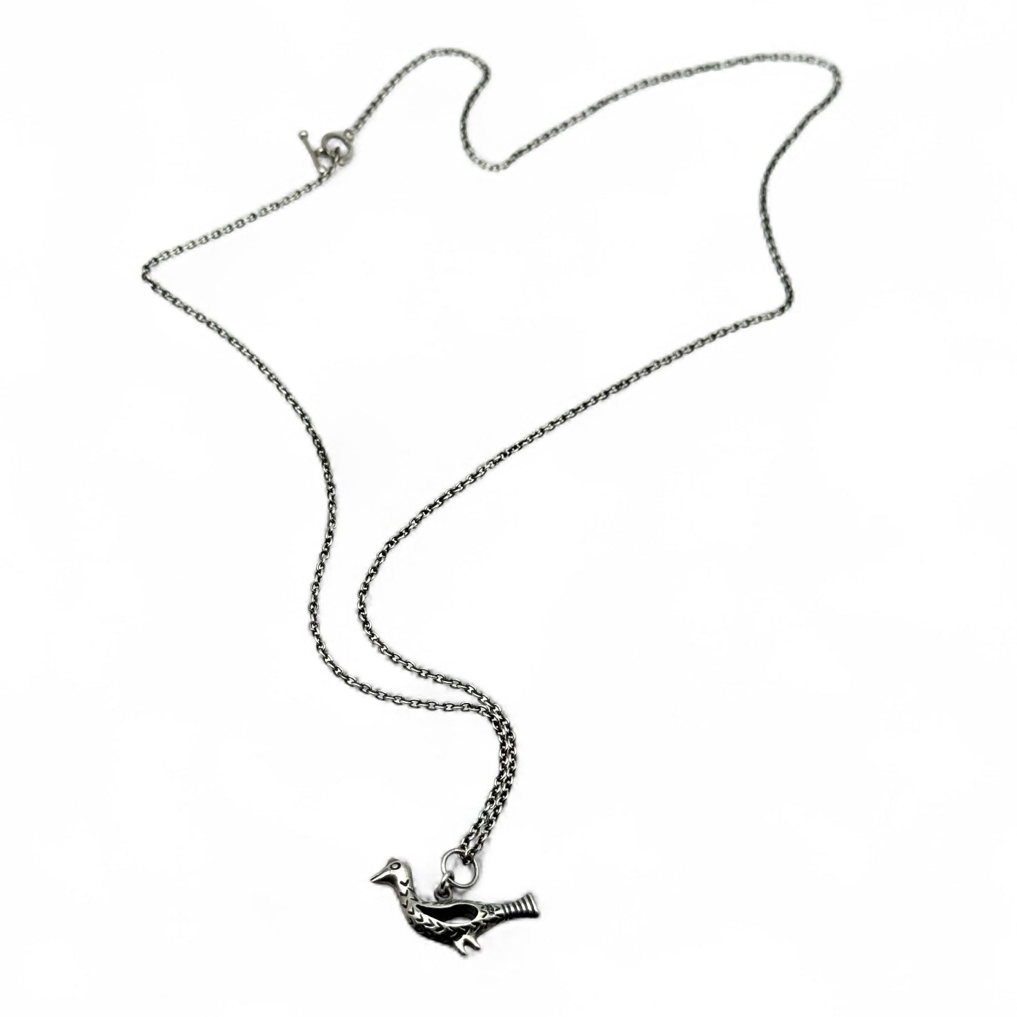925 Silver Long Viking Bird/Dove Toggle Clasp Necklace measuring 72cm long with a sweet toggle clasp stamped '925' on the ring. Possibly a Kalevala Koru piece, this beautiful necklace features a bird brooch, likely a dove crafted in 925 silver as a reproduction of one of the artefacts found in Sweden from the Viking period (793 AD to 1066 AD) e.g., Blekinge. The bird has a simple cut out design and with arrowhead or chevron marks depicting his feathers. He is stamped '925' on the one side and the necklace and pendant together weigh 9.3g.