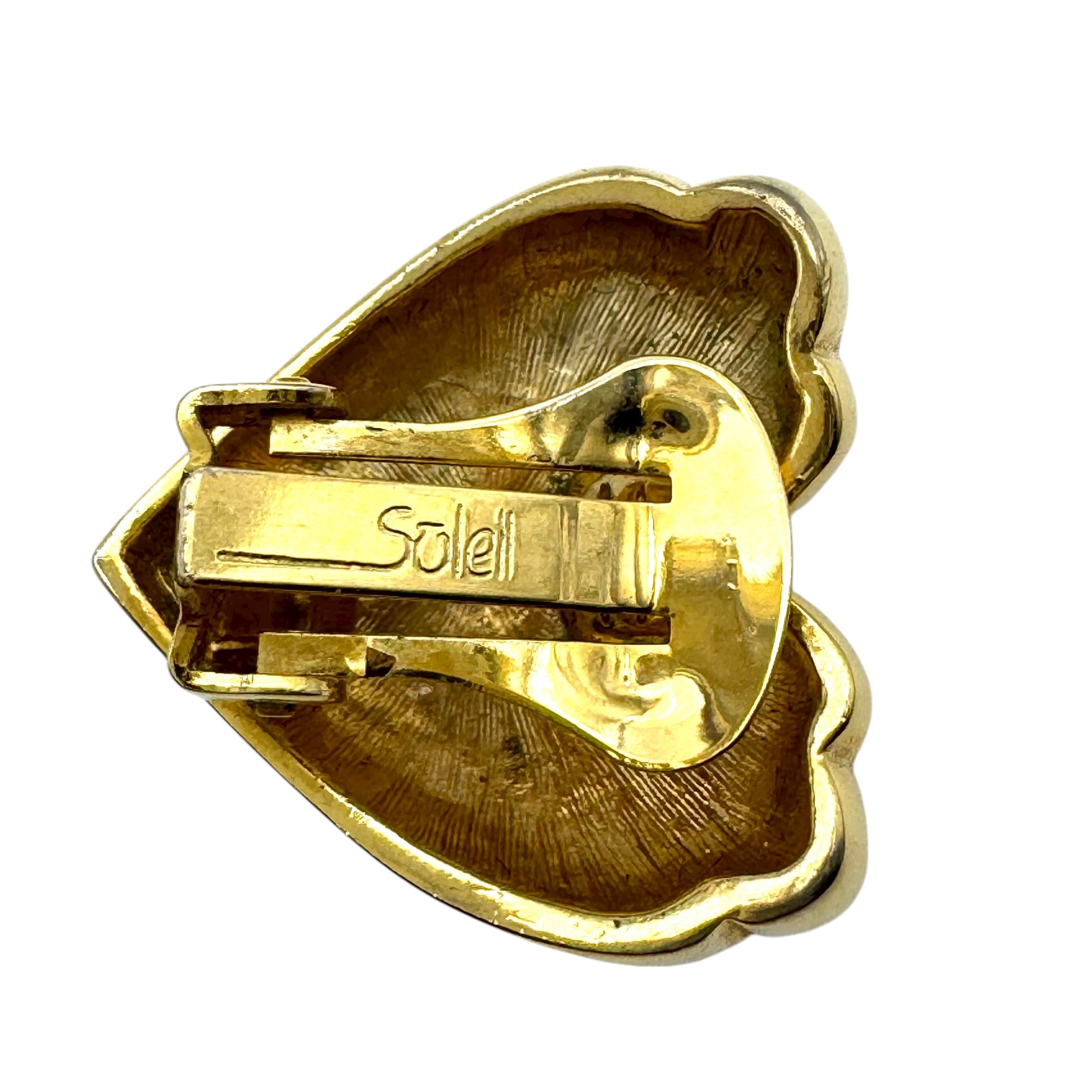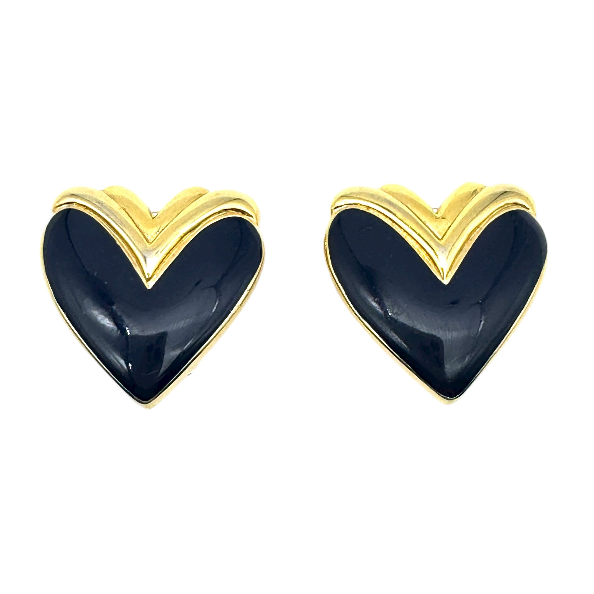 Soleil Navy Blue Enamel Heart-Shaped Clip On Earrings featuring a pair of heart-shaped clip on earrings in a deep navy enamel and crowned with a gold plated double rib detail. These lovely earrings measure 2.3cm high and they are 2.2cm at their widest point. They are signed on the back of both clips 'SOLEIL' and together they weigh 17.4g.
