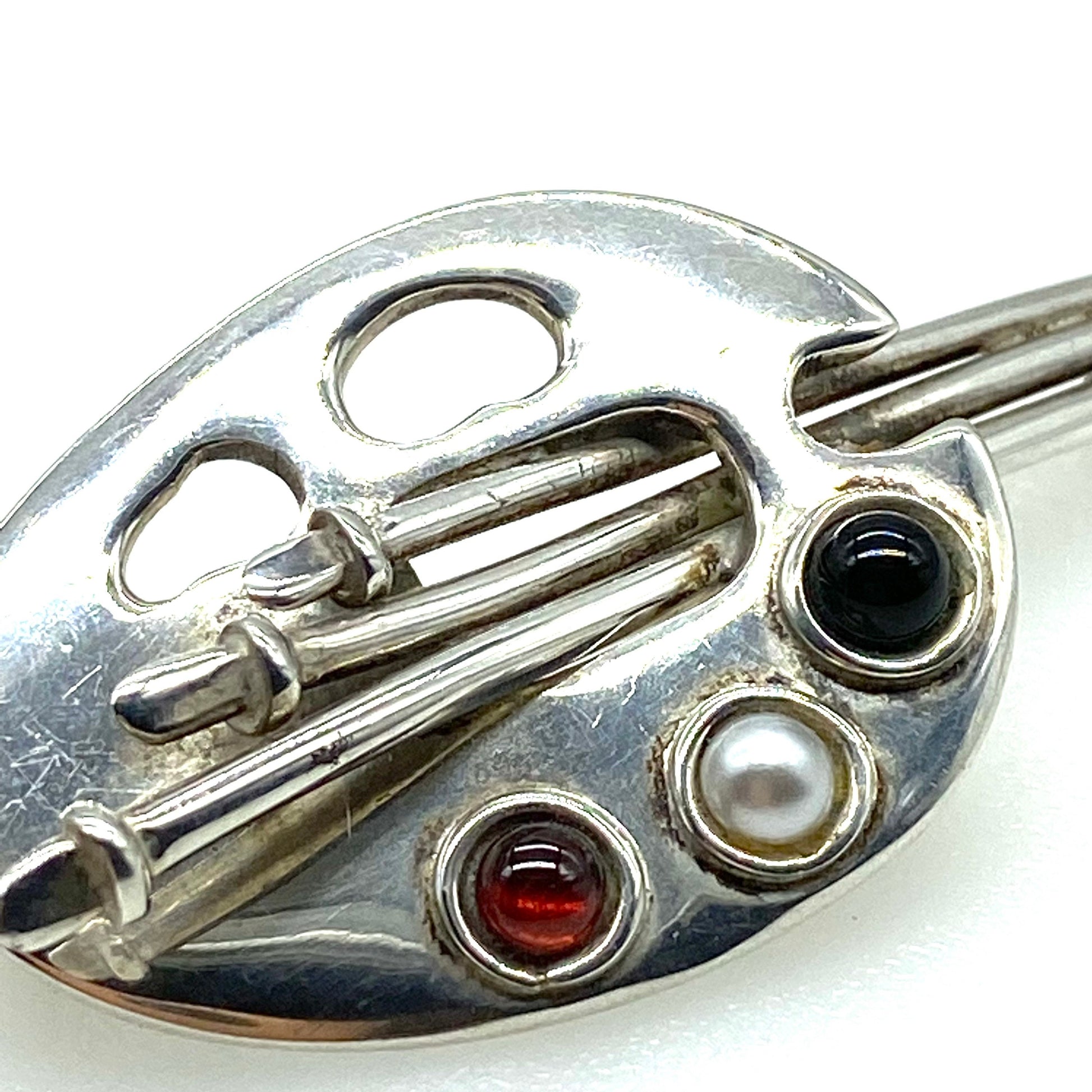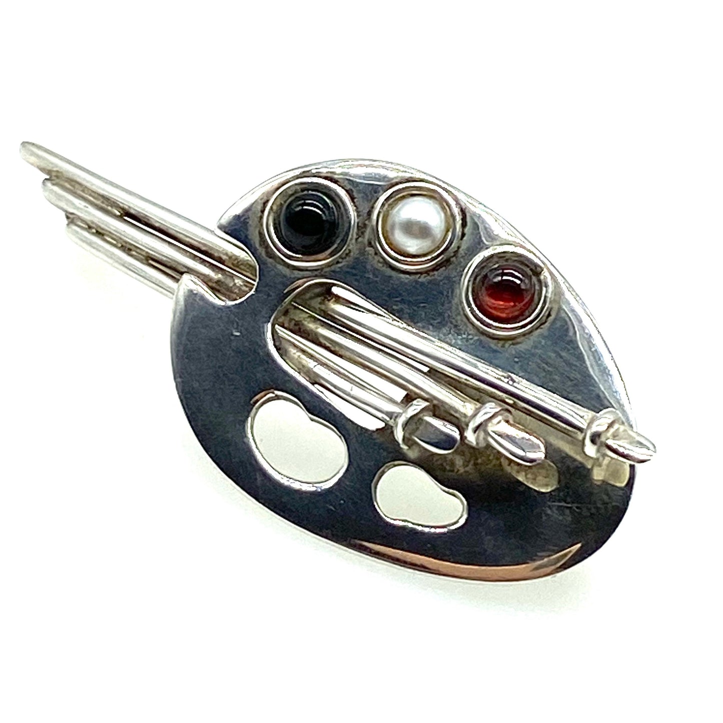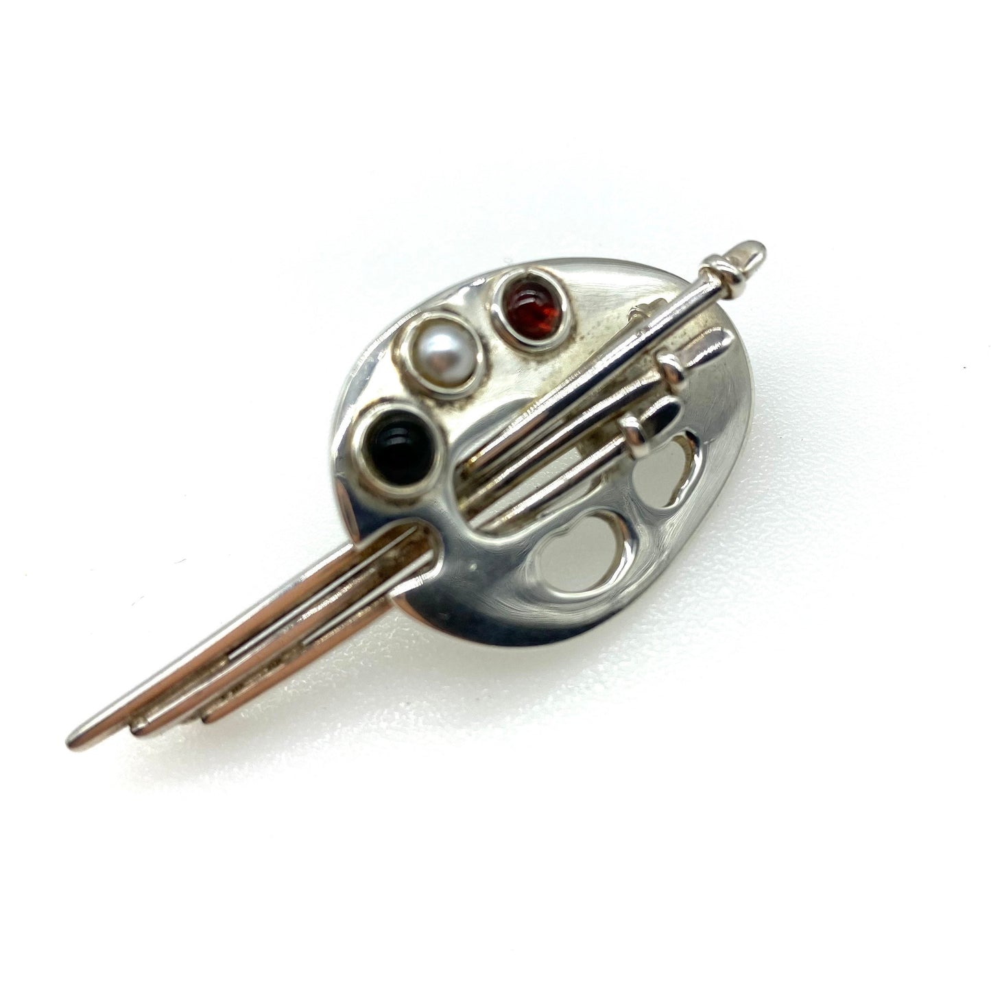 925 Silver Artist's Palette Brooch featuring an artist's palette with three silver brushes and three bezel set cabochons in red glass, black glass and a white faux pearl representing the paint colours. This lovely brooch has a rollover clasp and is stamped 925 on the reverse. It measures 2.6cm tall and 6cm wide and it weighs 13.1g. A lovely gift for any aspiring artist.