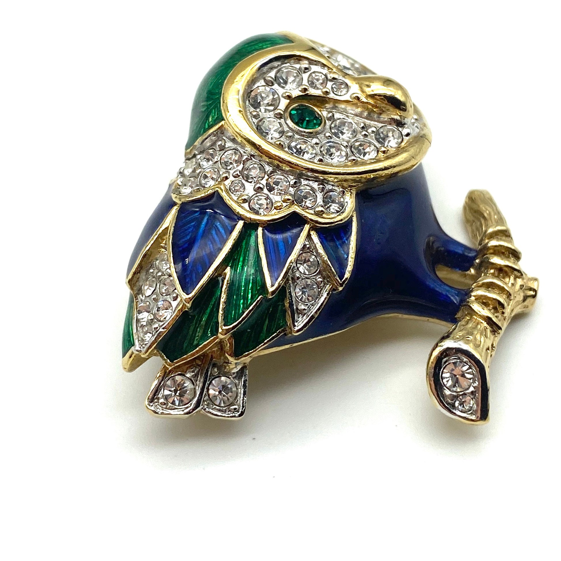 Attwood and Sawyer 22ct Gold Plated Enamel Owl Brooch on Branch featuring a beautiful owl with pave set crystal face with green crystal eyes and a feathered body of green enamel and blue enamel and pave set crystals. He is perched on a bark textured 22ct gold plate branch with a pave set crystal visible at the one end. He has a rollover clasp and is signed A & S on the reverse.