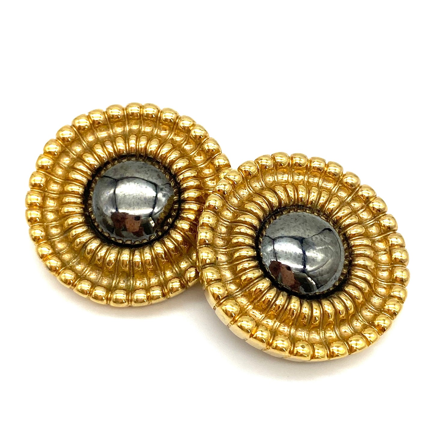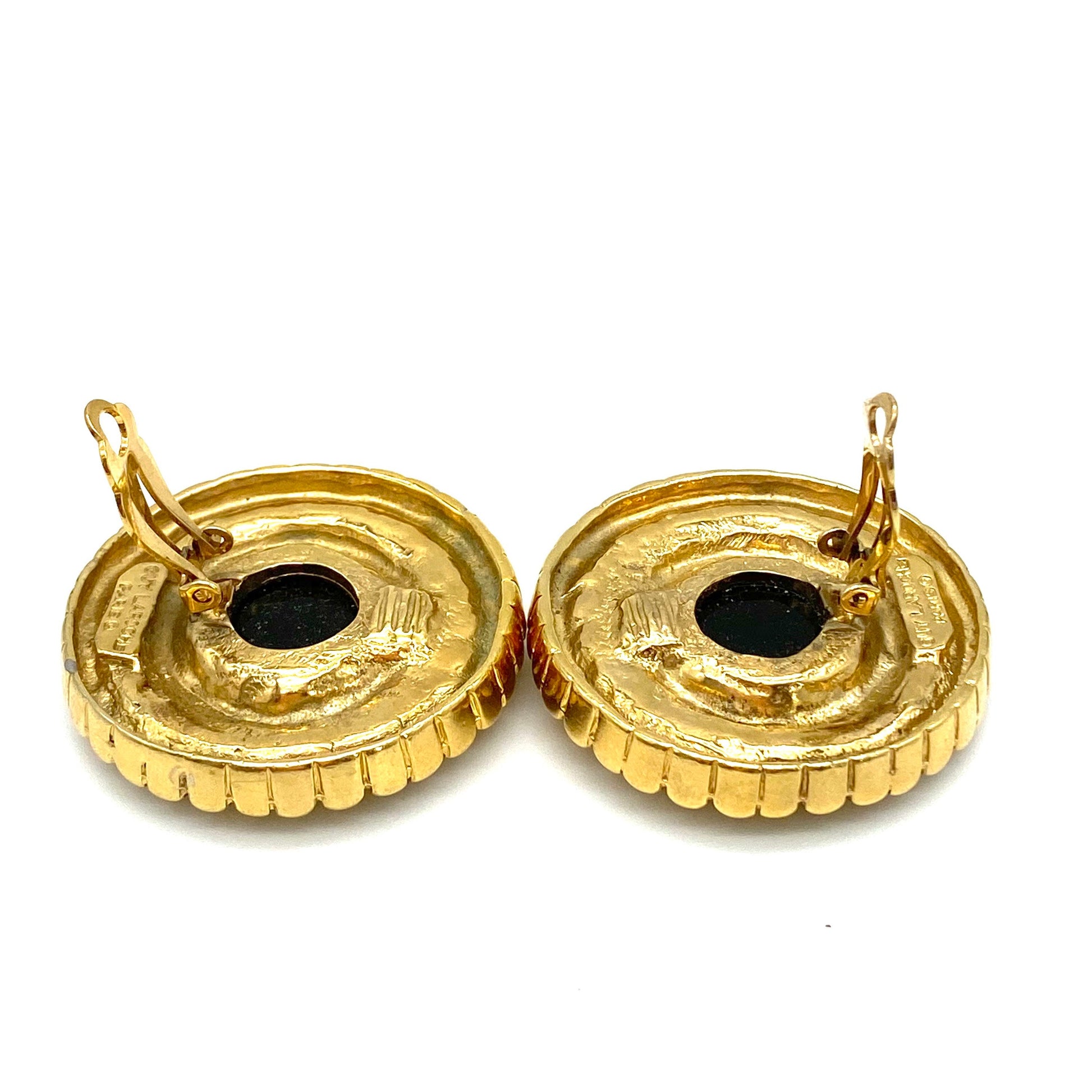 Guy Laroche (Paris) Clip On Earrings featuring a beautiful central disc possibly haematite, set inside a wide textured gold frame. The earrings measure 4cm Diameter and weigh 56g.
