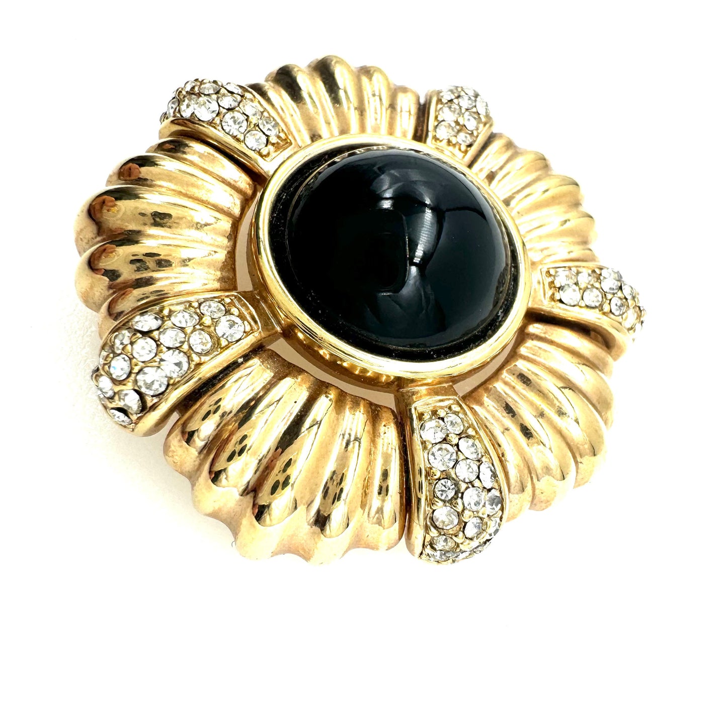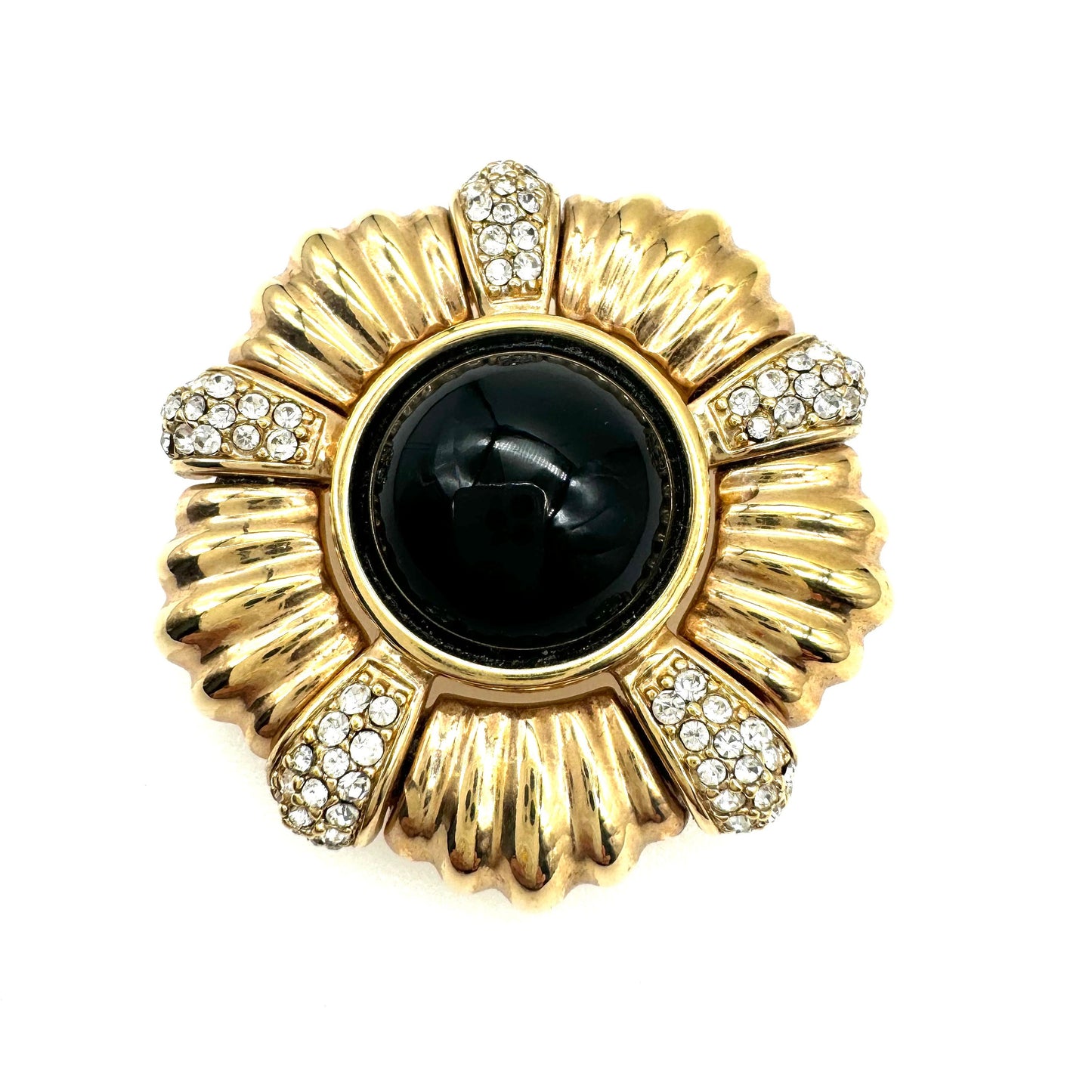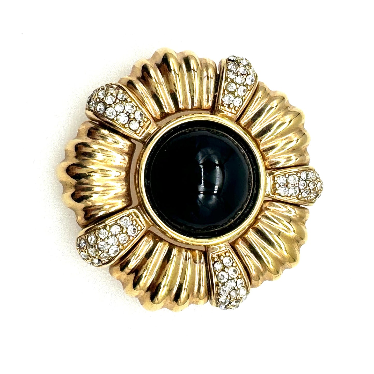 S.A.L. Swarovski America Limited 18ct Gold Plated Black Glass Cabochon and Crystal Brooch featuring an 18ct Gold Plated Brooch with a central round black glass cabochon framed in a radiating ribbed design with five decorative pave set clear Swarovski crystal accents. This gorgeous brooch measures 5.5cm diameter and weighs a hefty 35.4g. It has a rollover pin and it is signed S.A.L. on the reverse. Swarovski America Limited, S.A.L. was the name under which the famed Austrian crystal company first began manufacturing their own jewellery in the United States. The "S.A.L" mark was used from 1977 to 1988 until it was replaced with the now globally renowned swan hallmark, that continues to represent Swarovski jewellery today. A richly gold plated quality brooch from the 1980's.