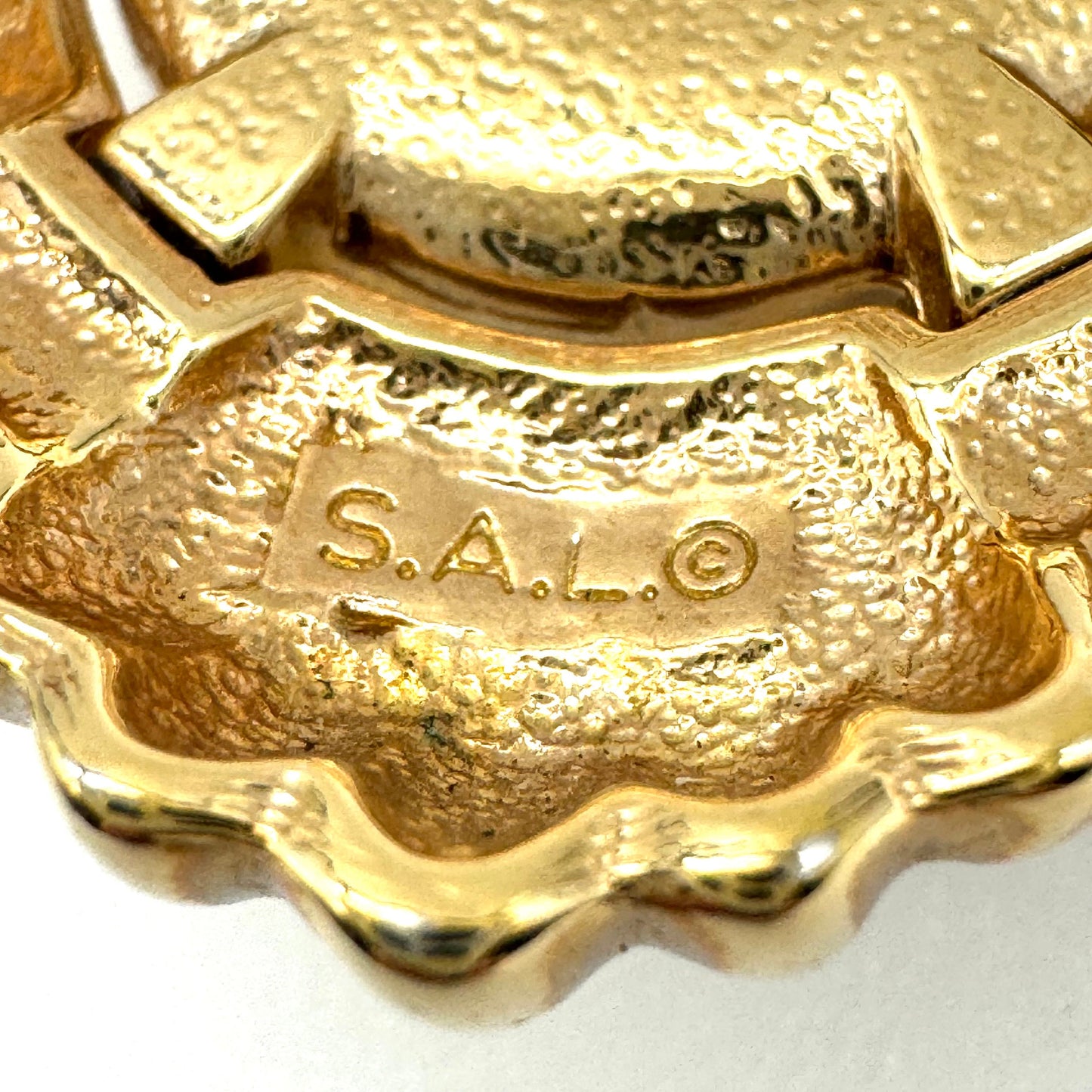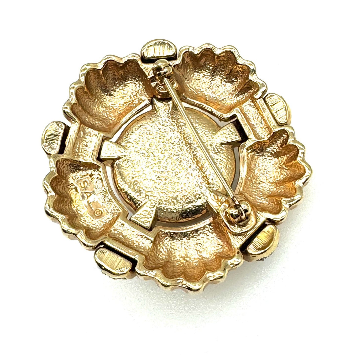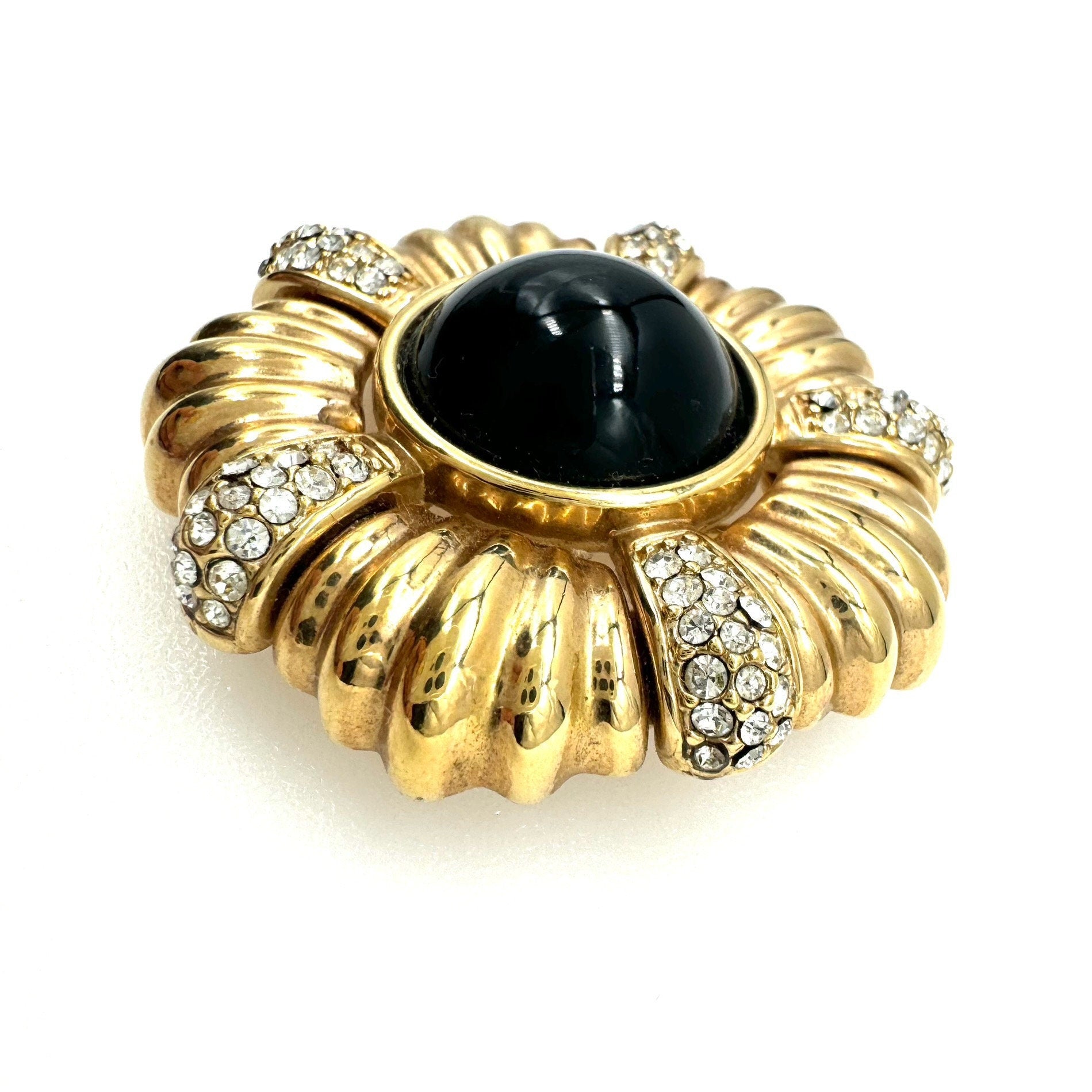S.A.L. Swarovski America Limited 18ct Gold Plated Black Glass Cabochon and Crystal Brooch featuring an 18ct Gold Plated Brooch with a central round black glass cabochon framed in a radiating ribbed design with five decorative pave set clear Swarovski crystal accents. This gorgeous brooch measures 5.5cm diameter and weighs a hefty 35.4g. It has a rollover pin and it is signed S.A.L. on the reverse. Swarovski America Limited, S.A.L. was the name under which the famed Austrian crystal company first began manufacturing their own jewellery in the United States. The "S.A.L" mark was used from 1977 to 1988 until it was replaced with the now globally renowned swan hallmark, that continues to represent Swarovski jewellery today. A richly gold plated quality brooch from the 1980's.