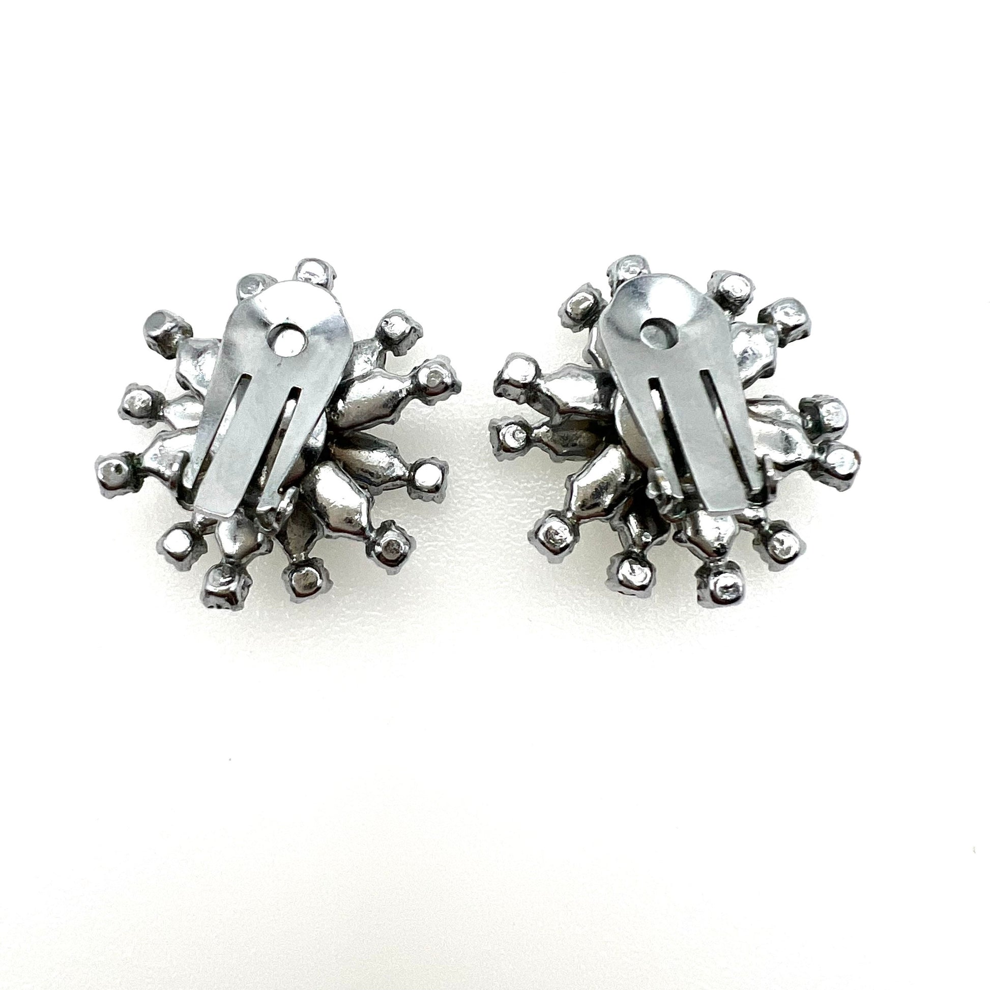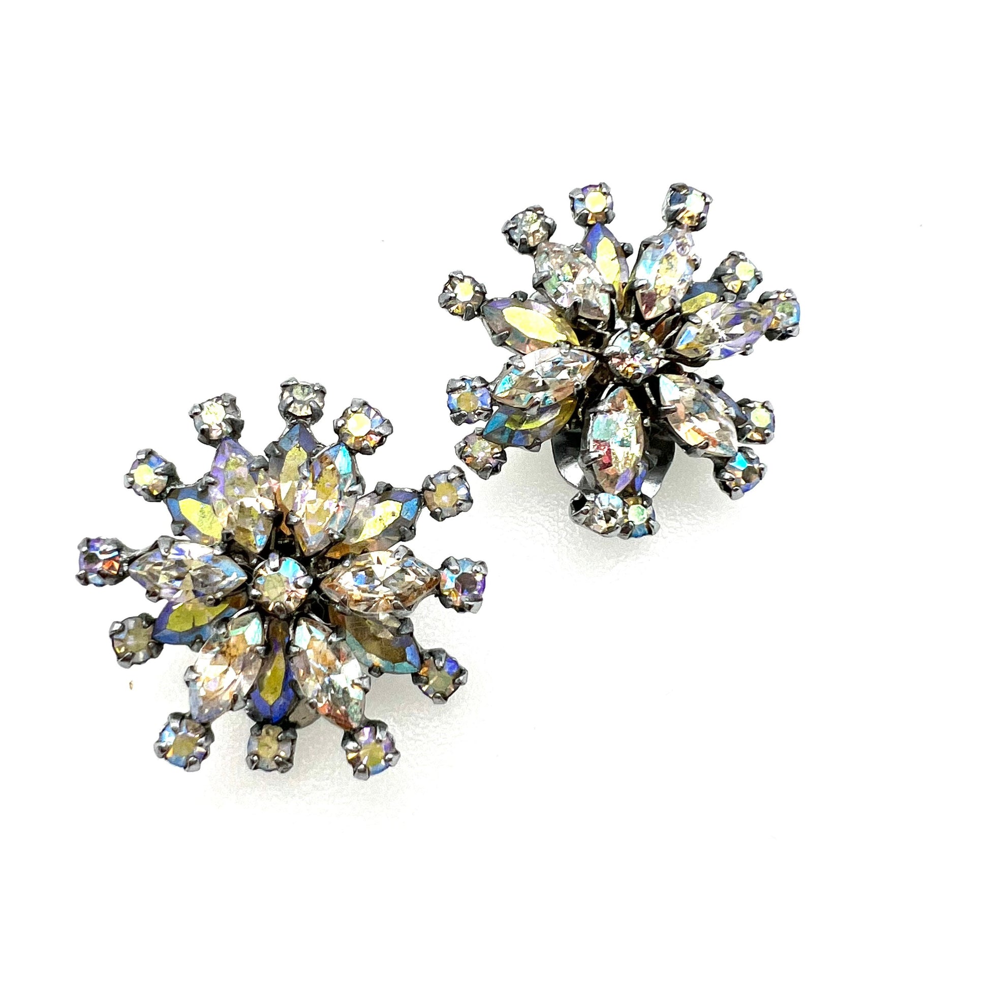 Signed Austria Aurora Borealis Clip On Earrings featuring a radiating layered design comprising round and navette claw set aurora borealis rhinestones. There is a little wear to the AB coating on close inspection, but nothing to detract from the wonderful sparkle from these lovely clip on earrings and this is also reflected in the price. They are both signed 'AUSTRIA' at the base of the clips and they measure 2.8cm diameter and together weigh 12.3g.