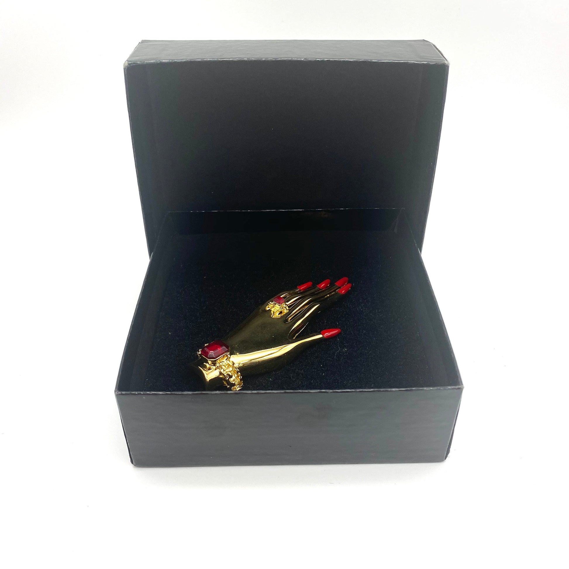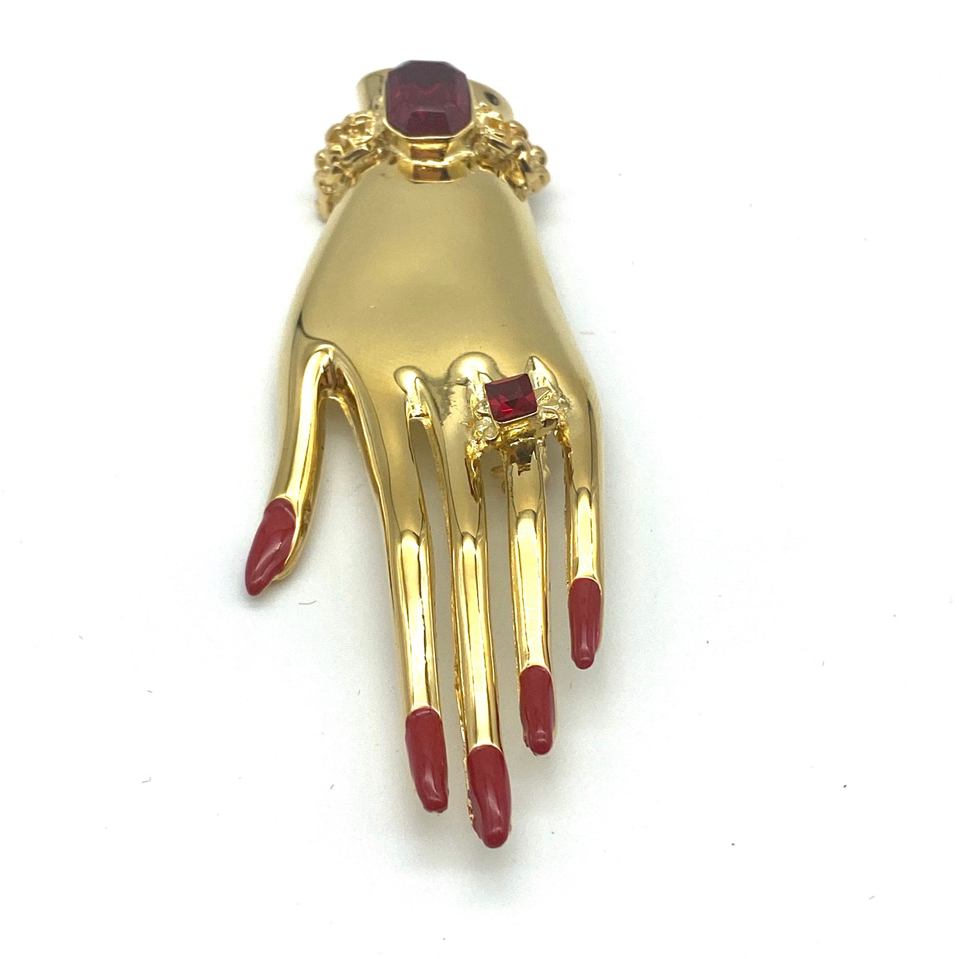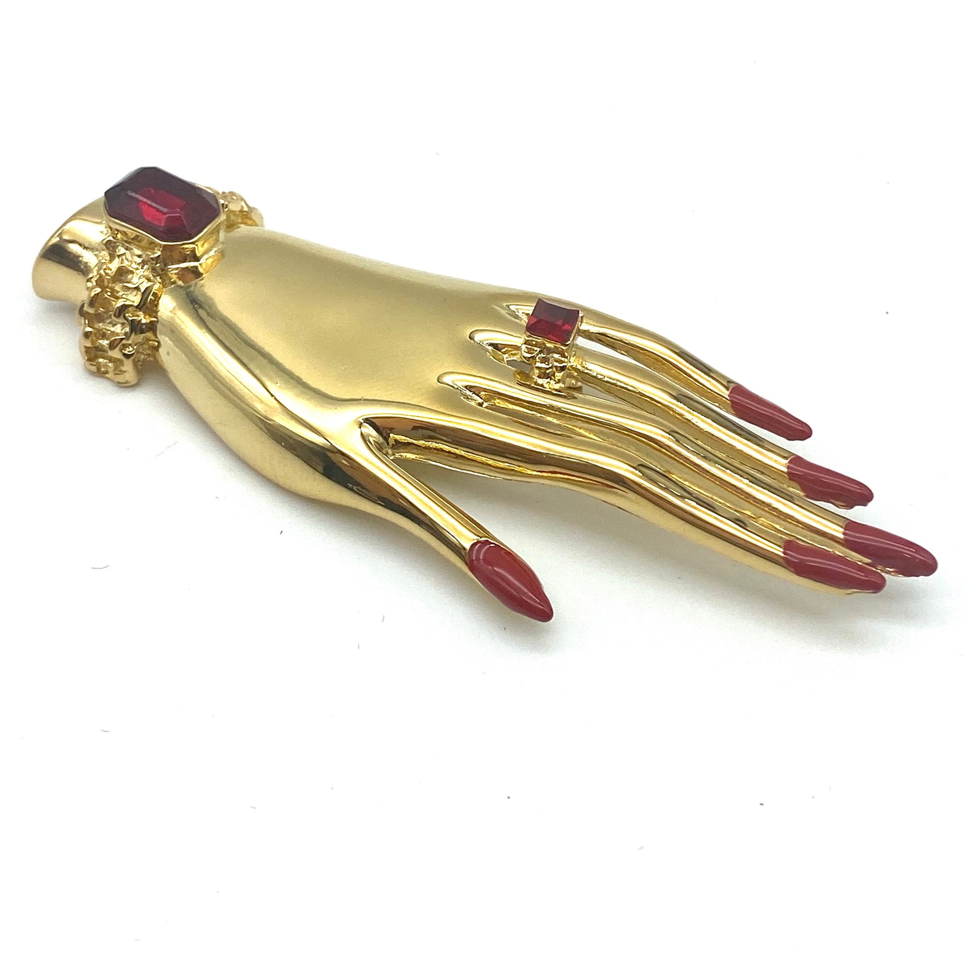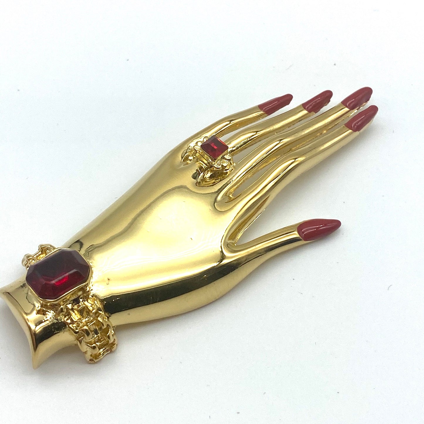 A RARE Butler and Wilson hand brooch in Original Box (As New), based on Coro's 1940's bejewelled elegant hand brooch, which was designed to symbolise 'friendship'. Butler and Wilson's version from the 1980's is approximately 2.4cm longer than the Coro version, which means the fingers with the red enamelled fingernails are more elongated and a lot sleeker and slimmer.