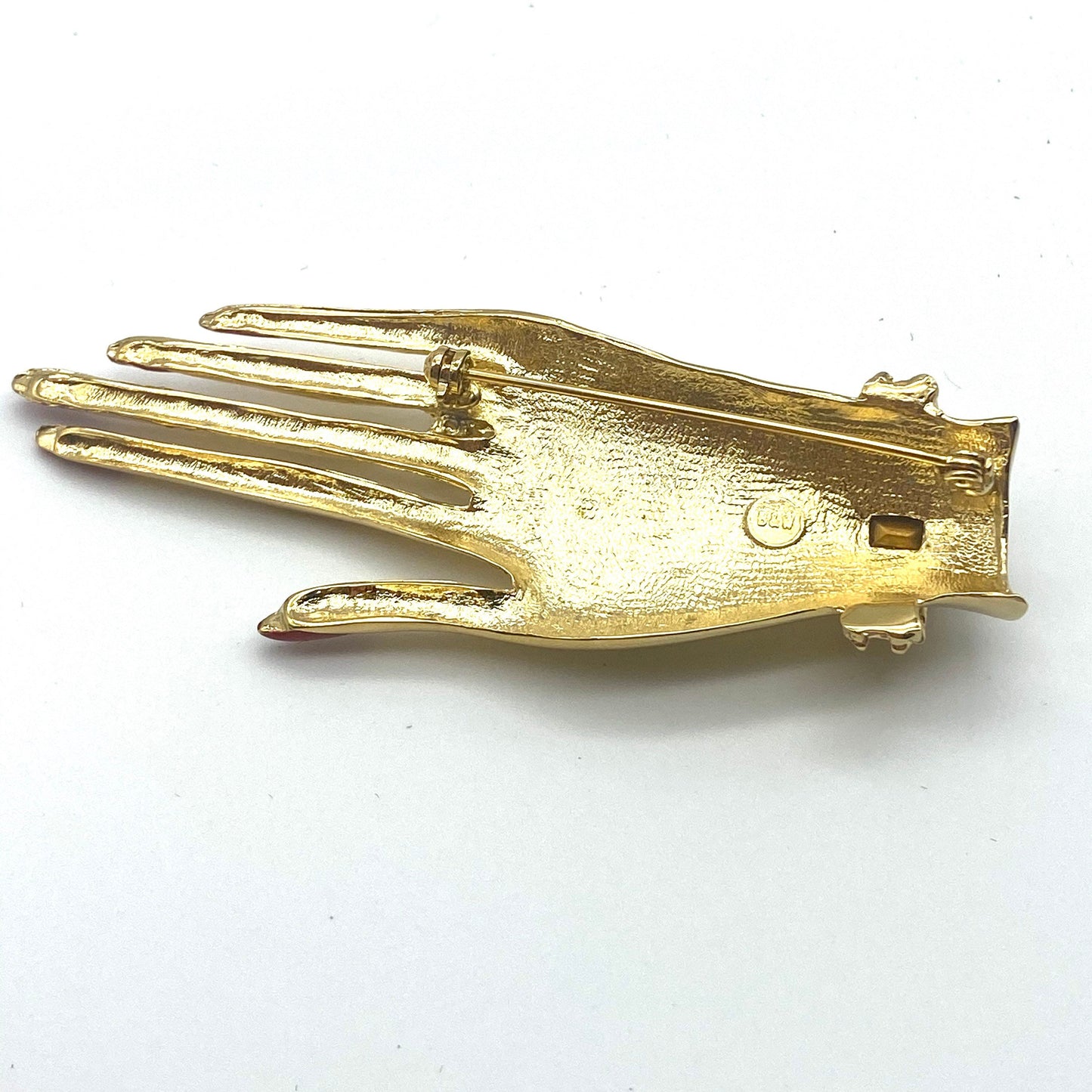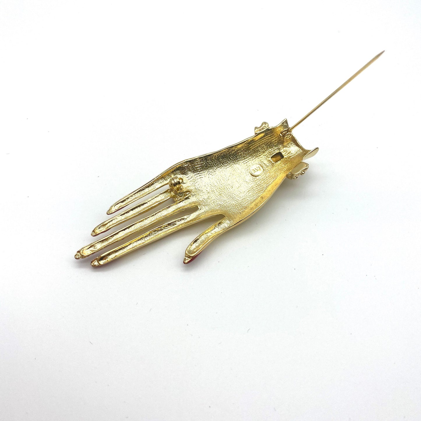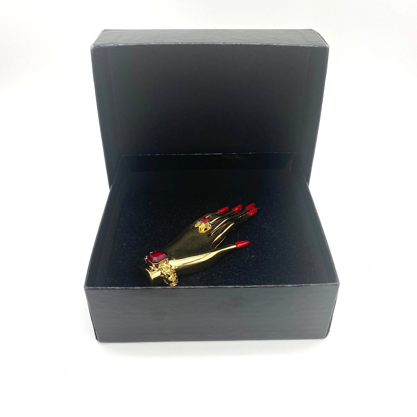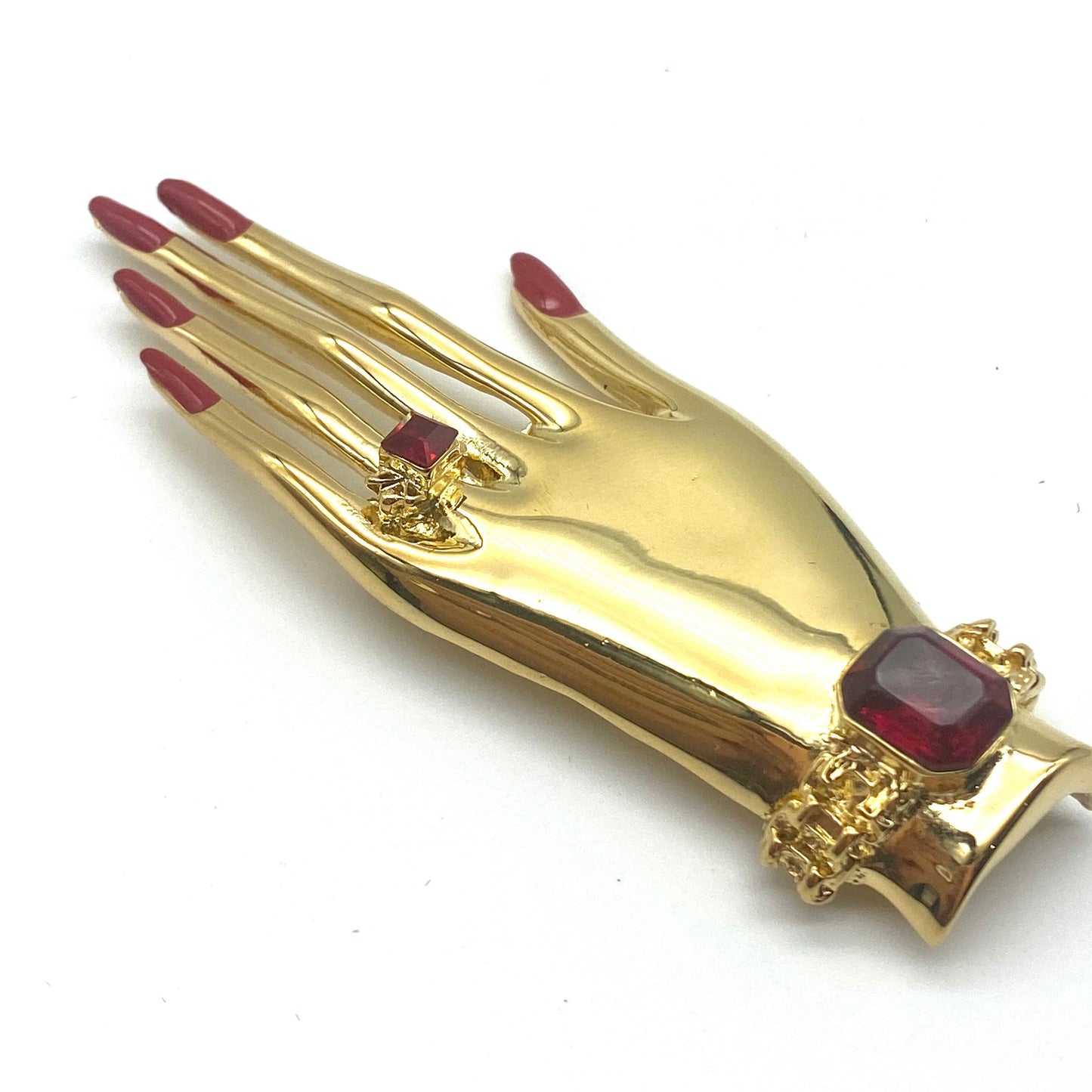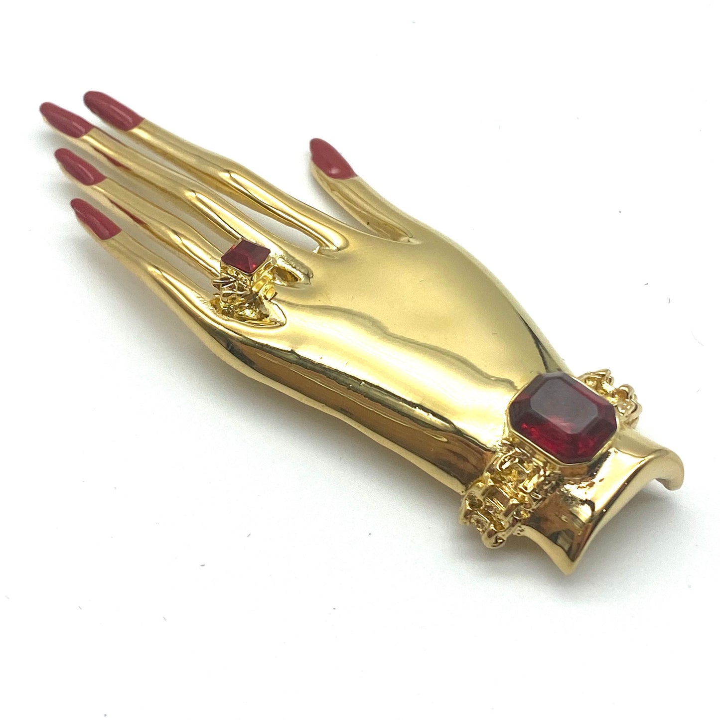 A RARE Butler and Wilson hand brooch in Original Box (As New), based on Coro's 1940's bejewelled elegant hand brooch, which was designed to symbolise 'friendship'. Butler and Wilson's version from the 1980's is approximately 2.4cm longer than the Coro version, which means the fingers with the red enamelled fingernails are more elongated and a lot sleeker and slimmer.